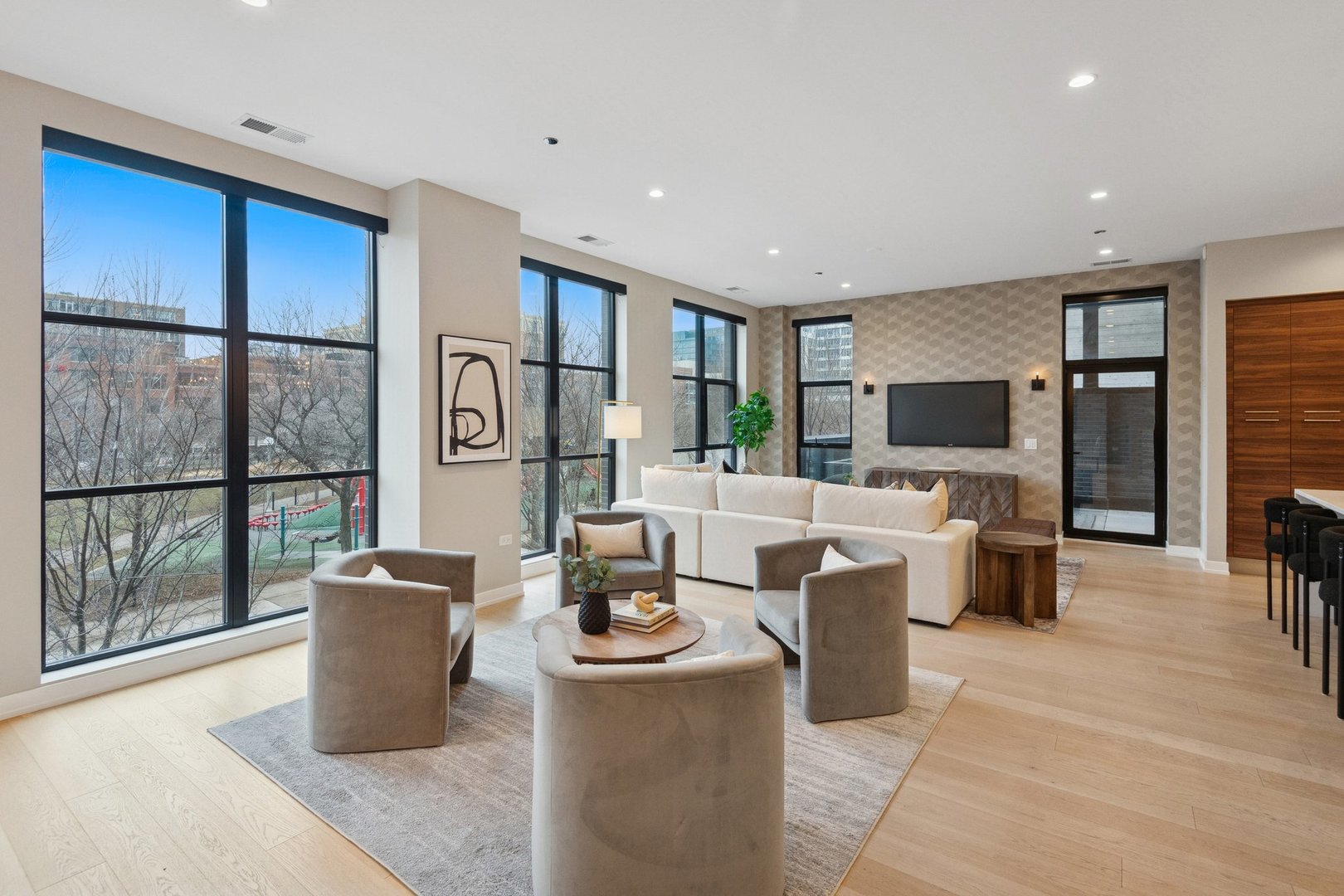 Across from the Mary Bartelme Park in the West Loop, this one-of-a-kind home has 5700 SF of indoor/outdoor living space all on one level (3859 SF Interior & 1842 SF Exterior) in a boutique building of 5 private elevator residences! This home offers 5 en-suite bedrooms, powder room, plus a family room, office, and 3 garage spaces in an attached garage. The residence has a private elevator entry into a gallery that opens into a living / dining / kitchen / terrace space with floor-to-ceiling windows across 50 feet of frontage overlooking Mary Bartelme Park. The kitchen features Italian cabinetry from Archisesto, Wolf/ Sub-Zero appliances, a huge waterfall island, side pantry/ prep wall, and opens to a terrace that spans two sides of the unit that is fully hardscaped with concrete pavers throughout, finished brick parapet walls, and electrical, gas and water hook-ups for outdoor cooking, entertaining and landscaping. The spacious primary bedroom suite has a fully built-out 16' X 9' dressing room with make-up table, large double vanity bath with freestanding tub, separate shower, and water closet plus a door to an open air section of the outdoor terrace for morning coffee and private evening fires. All of the secondary bedrooms fit queen-sized beds and feature walk-in custom closets. This home also has a custom-built Laundry Room, in-unit waste chute, storage room, and access to a secure package room. Fabulous location that is walking distance to the award-winning Skinner West Elementary School, Whitney Young Magnet High School and UIC pedestrian bridge, and close to Restaurant Row, Fulton Market, boutique stores, coffee spots, fitness studios, and grocery stores.